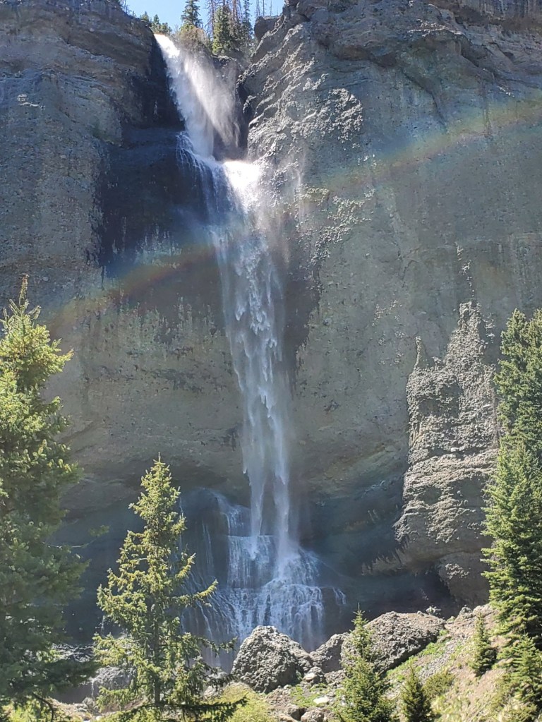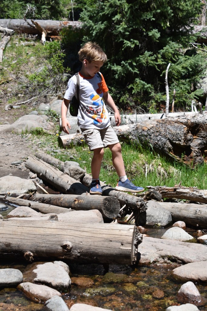 I missed out on the waterfall, which is my favorite thing to see on trips, BUT I would rather spend that time with the kids. We actually had a great time taking it slow back to the trailhead. We were surrounded by beautiful mountains, some still snowcapped. We walked through a beautiful field of flowers and had to balance like an acrobat across a couple of streams. It was a nice warm day without overcast. We were surrounded by pine trees most of the time with small sections of shade for us to take breaks.