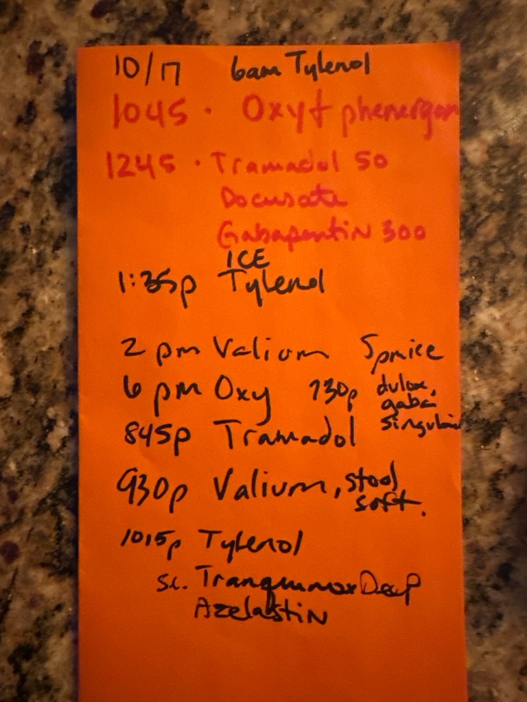 I was able to nap for 2 hours in the afternoon after the first Valium. but now I am wide awake with constant aching pain. I think walking around about 100 feet this evening exacerbated the surgical site. Back to the crutch then!